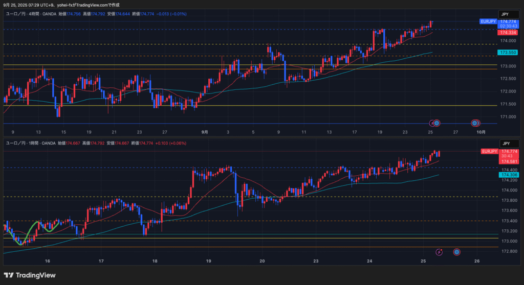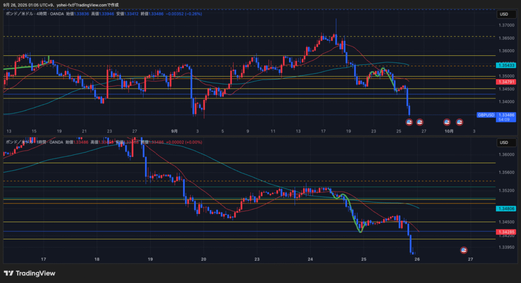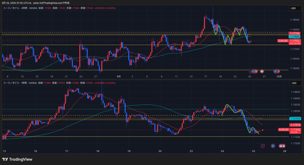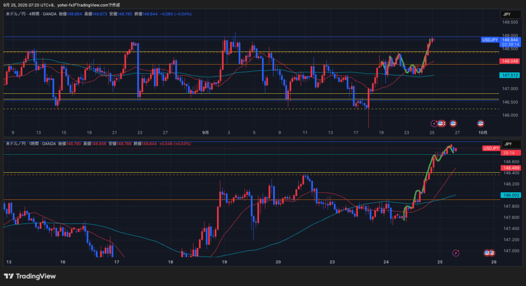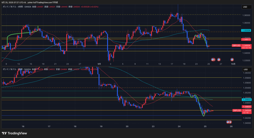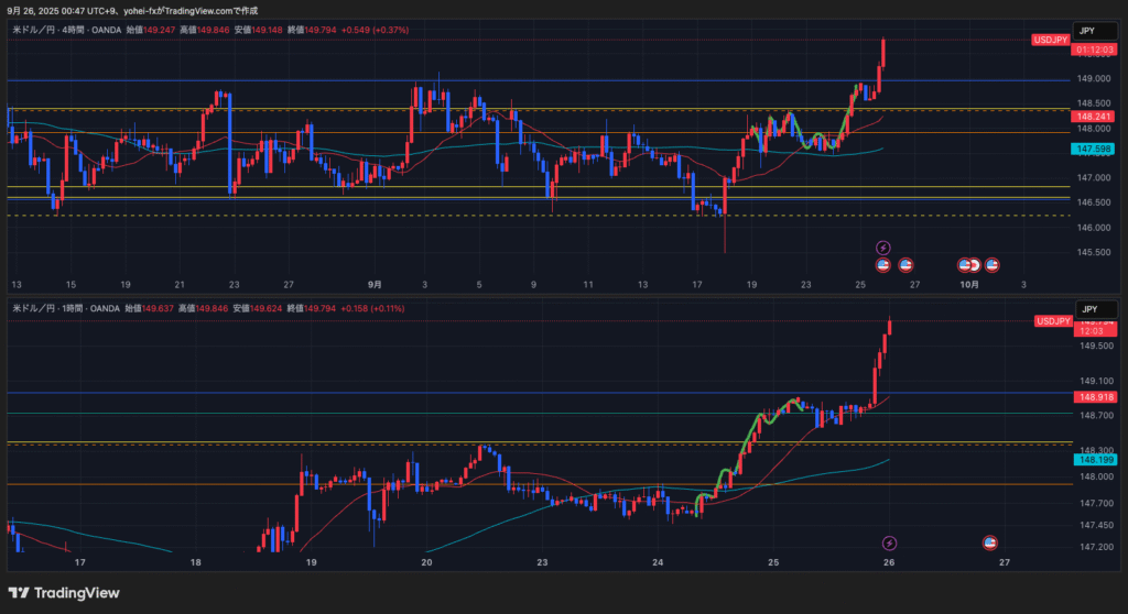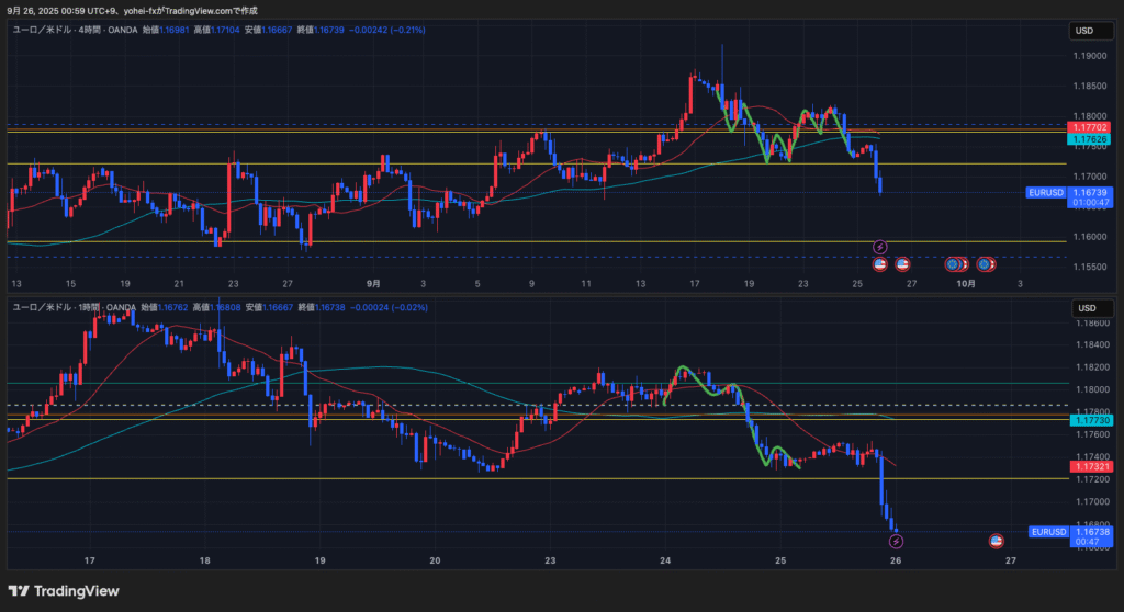 4時間トレンド転換シグナルは4H水平線(実線)あたりだが、移動平均線的に4H水平線(実線)での戻り売りは想定しない