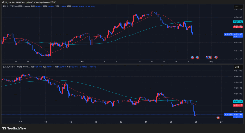 4時間下方向だが、日足移動平均線に支えられているので、積極的に売りは考えない
