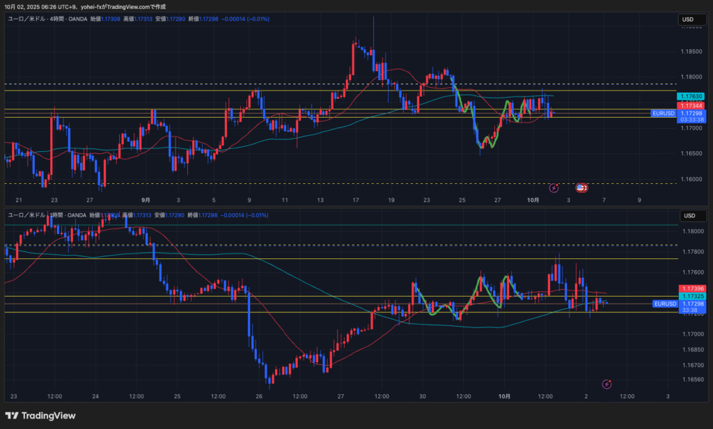 日足水平線(破線)の下に日足の買い支え勢力がいるが、4H水平線での戻り売りを狙う