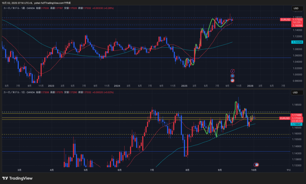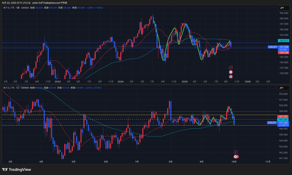 日足は下方向になったが、週足水平線(2本目)の下に週足の買い支え勢力がいる
