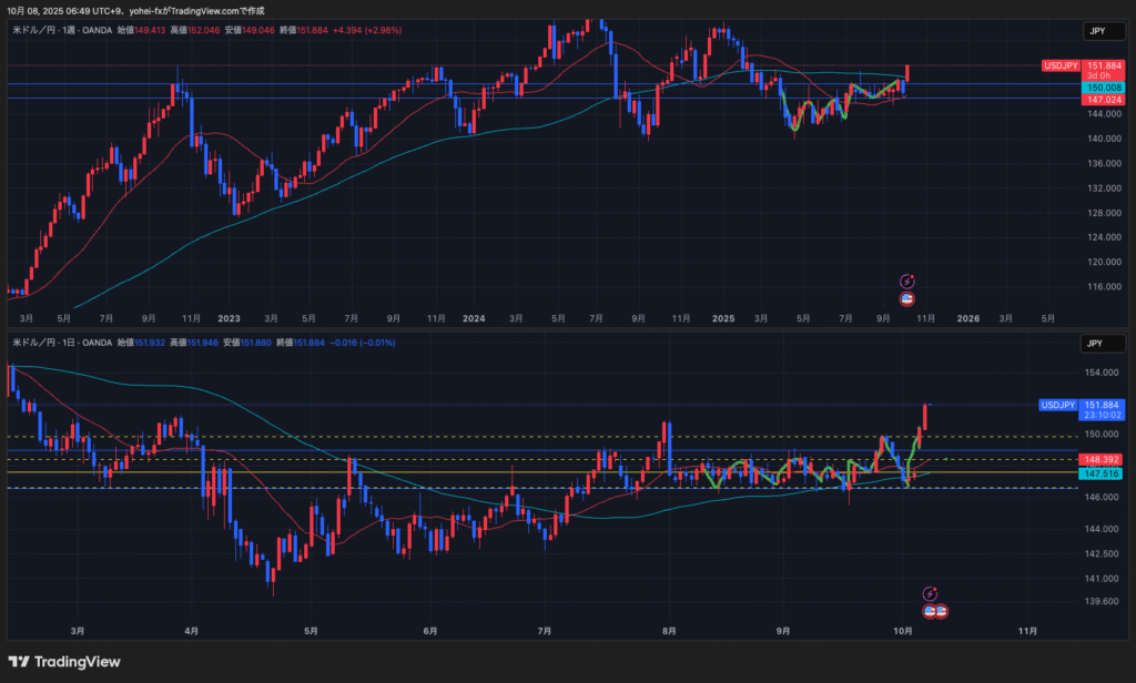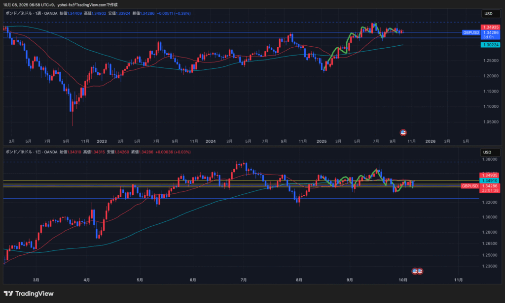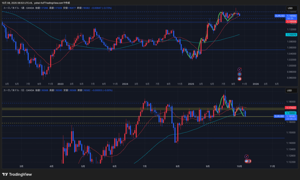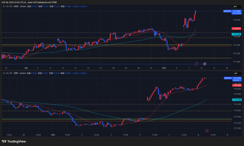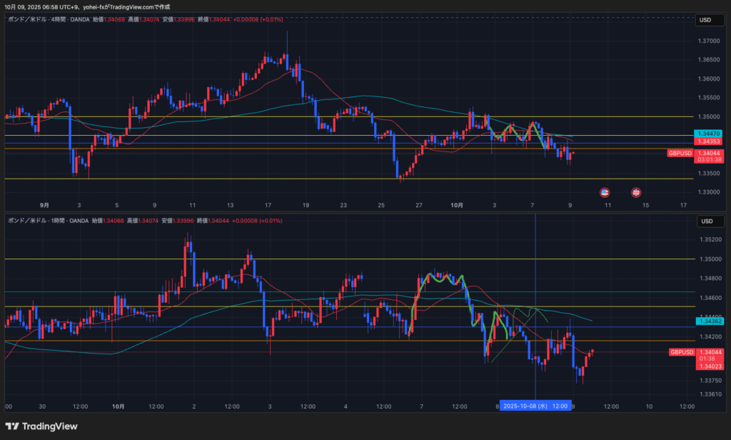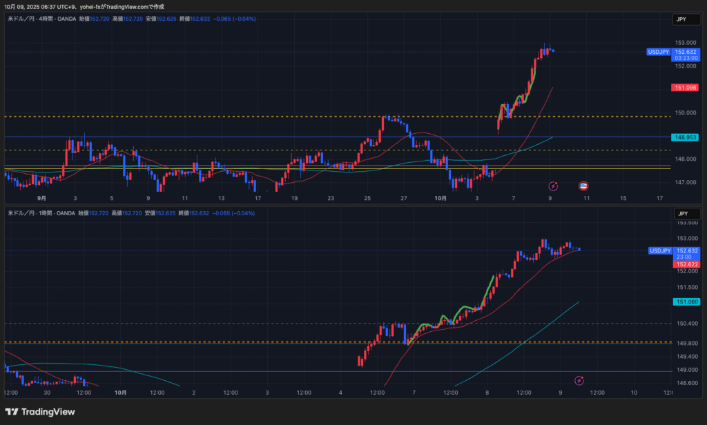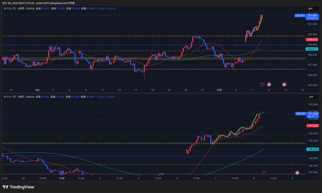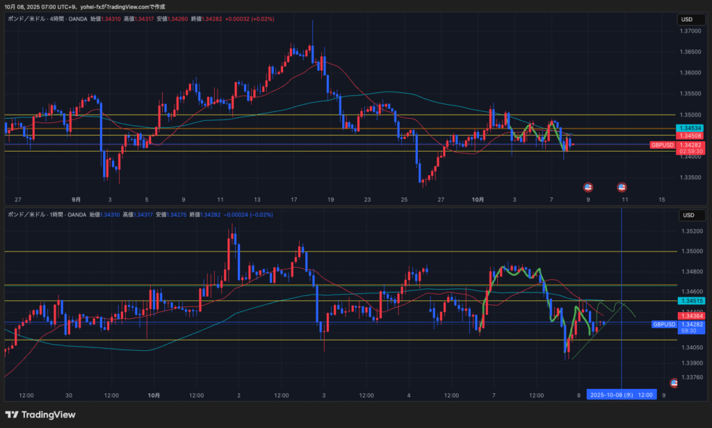 仮に1時間足が安値を割っても移動平均線が支えているので下方向になったと見る勢力と、上継続と見る勢力で戦争が起きやすい